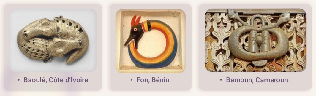 Toute fin est un début. La circularité, ou mieux, la récursivité dans l’organisation socio-économique des cités Africaines, tient compte des deux types de rétroaction possibles ; à savoir une rétroaction expansive, source de destruction créatrice, et une rétroaction stabilisante, limitant les excès du système. Ces dynamiques peuvent être observées, par exemple, dans le symbole Baoulé (Côte d’Ivoire) des deux crocodiles se mordant la queue qui représente l’équilibre entre gouvernant·e·s et gouverné·e·s, ou le serpent se mordant la queue chez les Fon (Bénin), ou encore dans le serpent à deux têtes des Bamoun (Cameroun). Ainsi aujourd’hui encore dans les cosmotechniques Africaines, la fin est le début est la fin.
