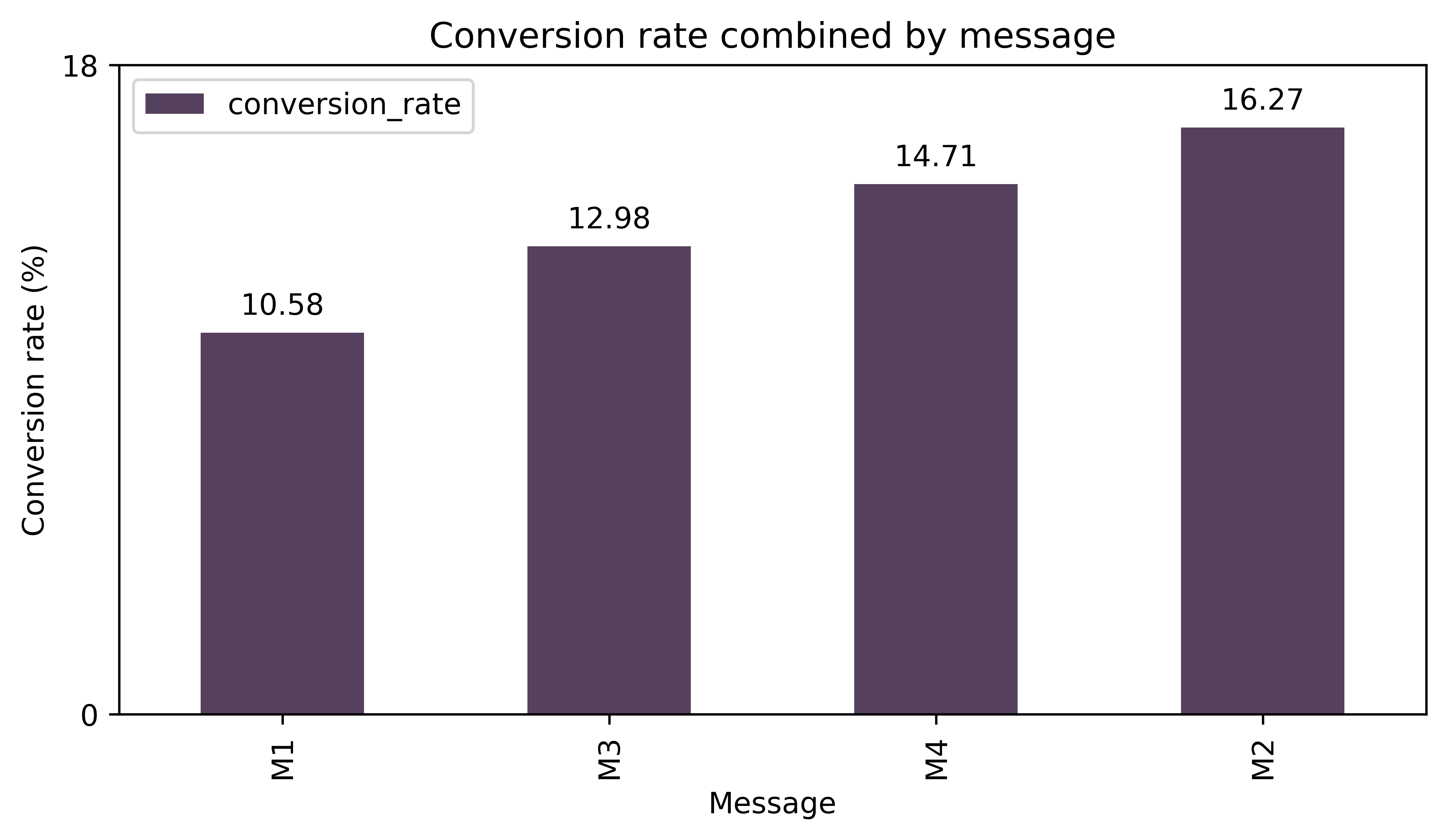Combining both groups, M2 (anchoring & identity) emerged as the clear winner with a 16.27% first-level conversion rate, followed by M4 (urgency and anchoring) at 14.71%.