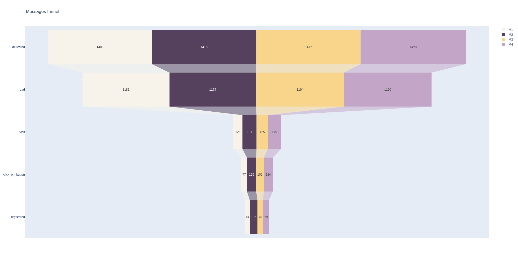 We also analyzed registration data, which confirmed M2’s superior performance. The following funnel provides a detailed breakdown of each message’s performance: