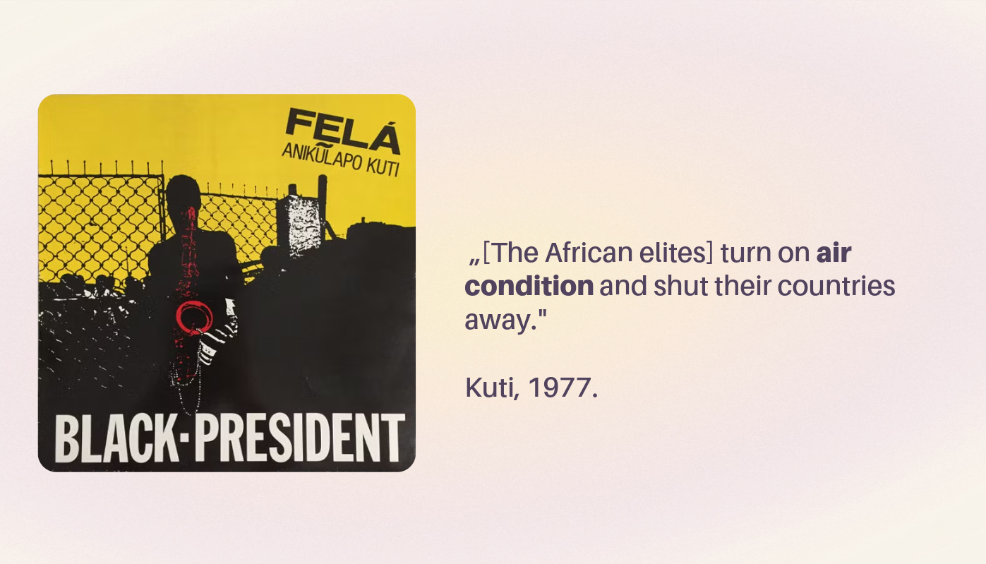 In seinem Titel „Colonial Mentality“ singt dazu Fela Kuti „[the African elites] turn on air condition and shut their countries away”. Diejenigen, die sich keine Klimaanlage leisten können, bauen Häuser, um dann in der Trockenzeit, wenn die Temperaturen bei über 40 Grad sind, draußen zu schlafen.