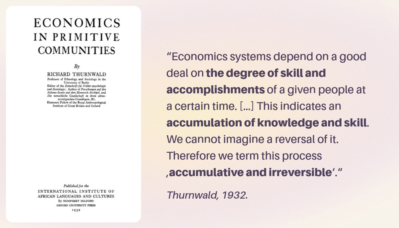 In diesem Zusammenhang ist auch Richard Thurnwalds Beobachtung von Bedeutung, dass wirtschaftliche Systeme stark von den Fähigkeiten und Kenntnissen eines Volkes in einer bestimmten Zeit abhängen. Thurnwalds stellt fest, dass die effizienteren und komplexeren Systeme auf den einfacheren aufbauen und diese Weiterentwicklung ein akkumulatives und irreversibles Phänomen darstellt. Diese Erkenntnis ist entscheidend, um zu verstehen, wie der Kolonialismus die natürliche Entwicklung afrikanischer Wissenssysteme abgebrochen hat, und dadurch auch die wirtschaftliche Prosperität beeinträchtigt hat.
