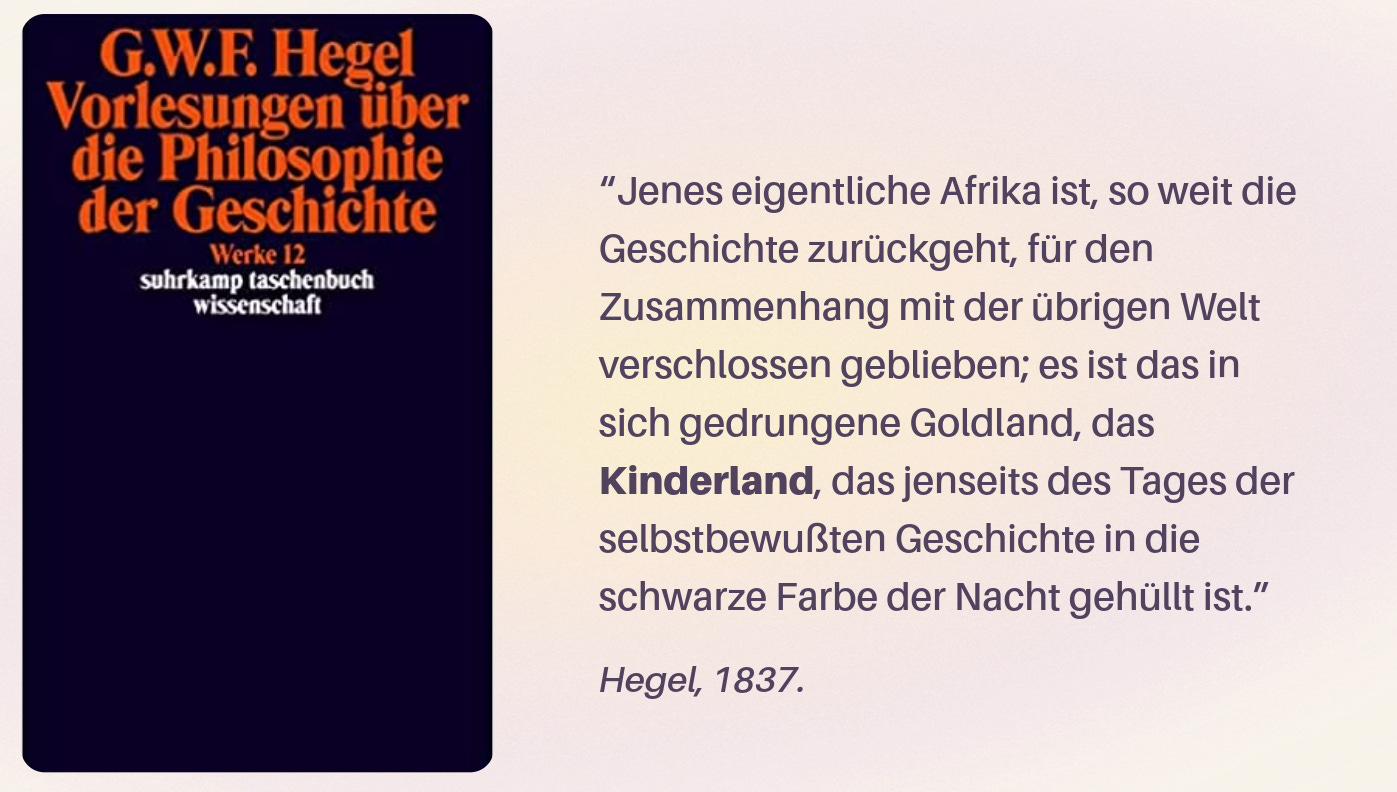 Hegel, mit seinen Vorlesungen zur Philosophie der Weltgeschichte, prägte einst das Bild von Afrika als einem Kontinent ohne Geschichte. In seinen Worten: “Jenes eigentliche Afrika ist, so weit die Geschichte zurückgeht, für den Zusammenhang mit der übrigen Welt verschlossen geblieben; es ist das in sich gedrungene Goldland, das Kinderland, das jenseits des Tages der selbstbewußten Geschichte in die schwarze Farbe der Nacht gehüllt ist.”