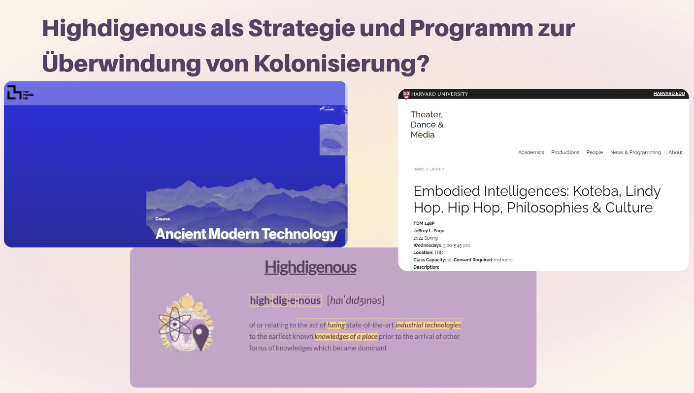 Highdigenous steht für die integrative Auseinandersetzung sowohl mit high-tech, also, mit den neuesten Technologien, als auch mit endogenen Wissensformen.