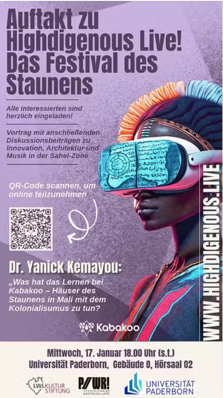 "Highdigenous Live! Das Festival des Staunens", das uns heute vereint, verkörpert die Essenz des Highdigenous-Konzepts in einem praktischen Rahmen. Als kulturelle Manifestation und interaktive Plattform soll Highdigenous Live der Verbreitung und Vertiefung des Verständnisses für die Re-Ko-Konstruktion von Wissen und die Dekolonisierung von Bildung und Wissenschaft dienen. Das Festival, das in Ost-Westfalen und an mehreren Orten in Mali stattfinden wird, vereint unterschiedliche Disziplinen und Weltanschauungen. Es bietet durch ein vielfältiges Programm aus Workshops, Diskussionen und Performances einen Einblick in die Anwendung und Bedeutung vom Highdigenous.