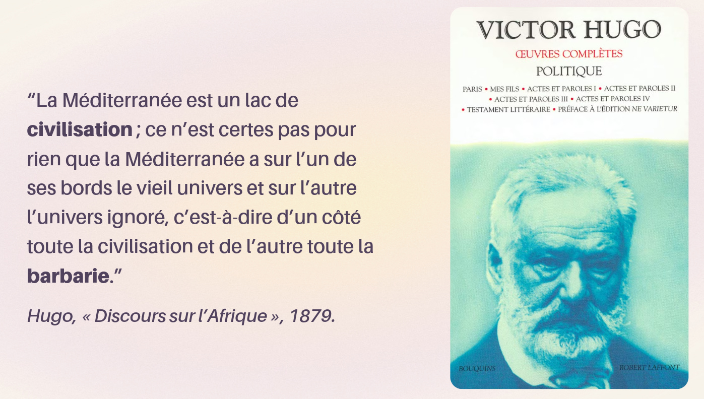 Gleichzeitig verfestigte Victor Hugo die Dichotomie zwischen dem zivilisierten Europa und dem als barbarisch angesehenen Afrika, als er schrieb: “La Méditerranée est un lac de civilisation ; ce n’est certes pas pour rien que la Méditerranée a sur l’un de ses bords le vieil univers et sur l’autre l’univers ignoré, c’est-à-dire d’un côté toute la civilisation et de l’autre toute la barbarie.”