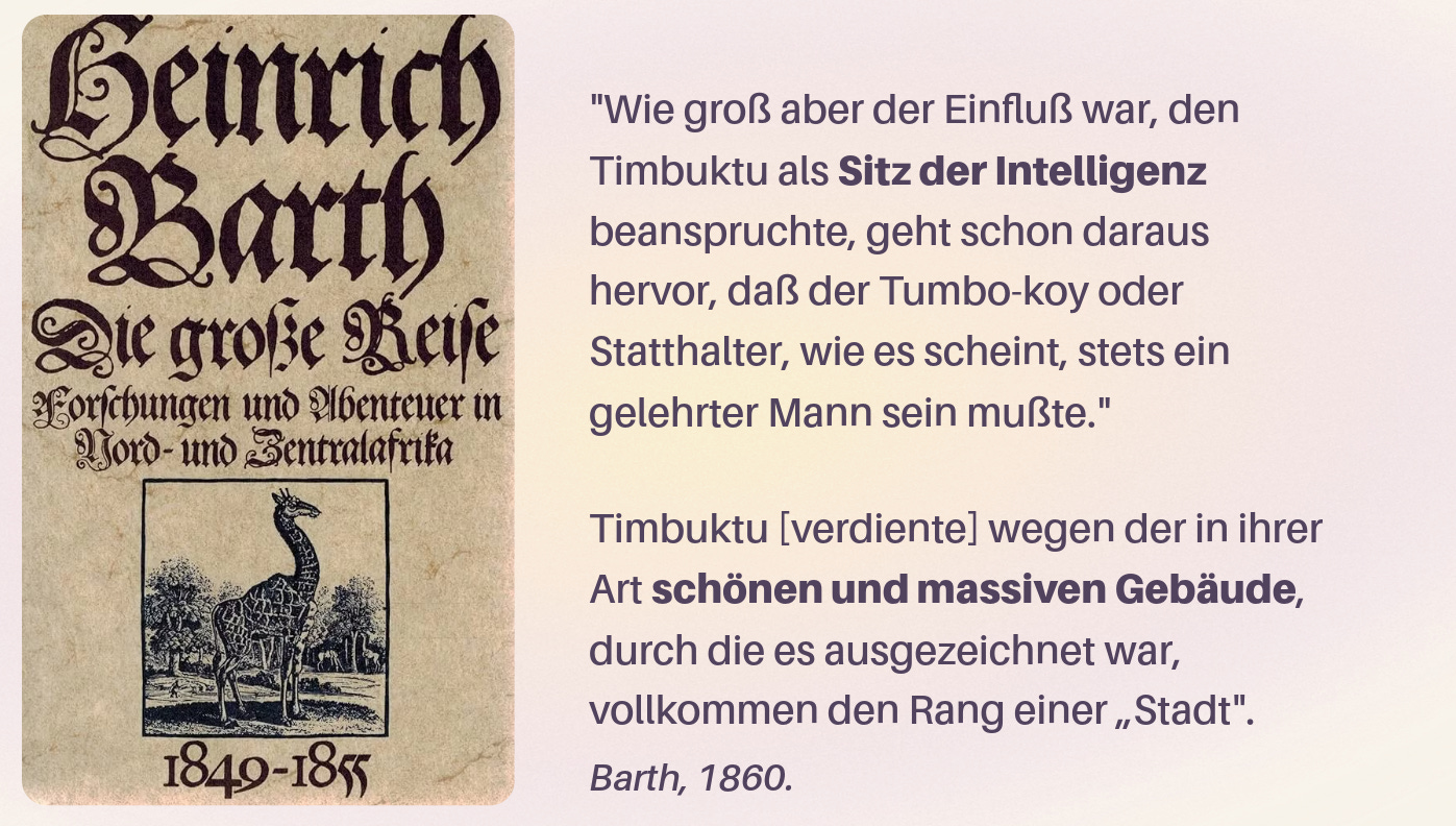 Dennoch war es den europäischen Gelehrten damals schon bekannt, dass Afrika eine reiche und komplexe Zivilisation besaß. Heinrich Barth, ein deutscher Forscher, schrieb im Jahr 1860 über Timbuktu: "Wie groß aber der Einfluß war, den Timbuktu als Sitz der Intelligenz beanspruchte, geht schon daraus hervor, daß der Statthalter von Timbuktou stets ein gelehrter Mann sein mußte. Timbuktu [verdiente] wegen der in ihrer Art schönen und massiven Gebäude, durch die es ausgezeichnet war, vollkommen den Rang einer „Stadt".”