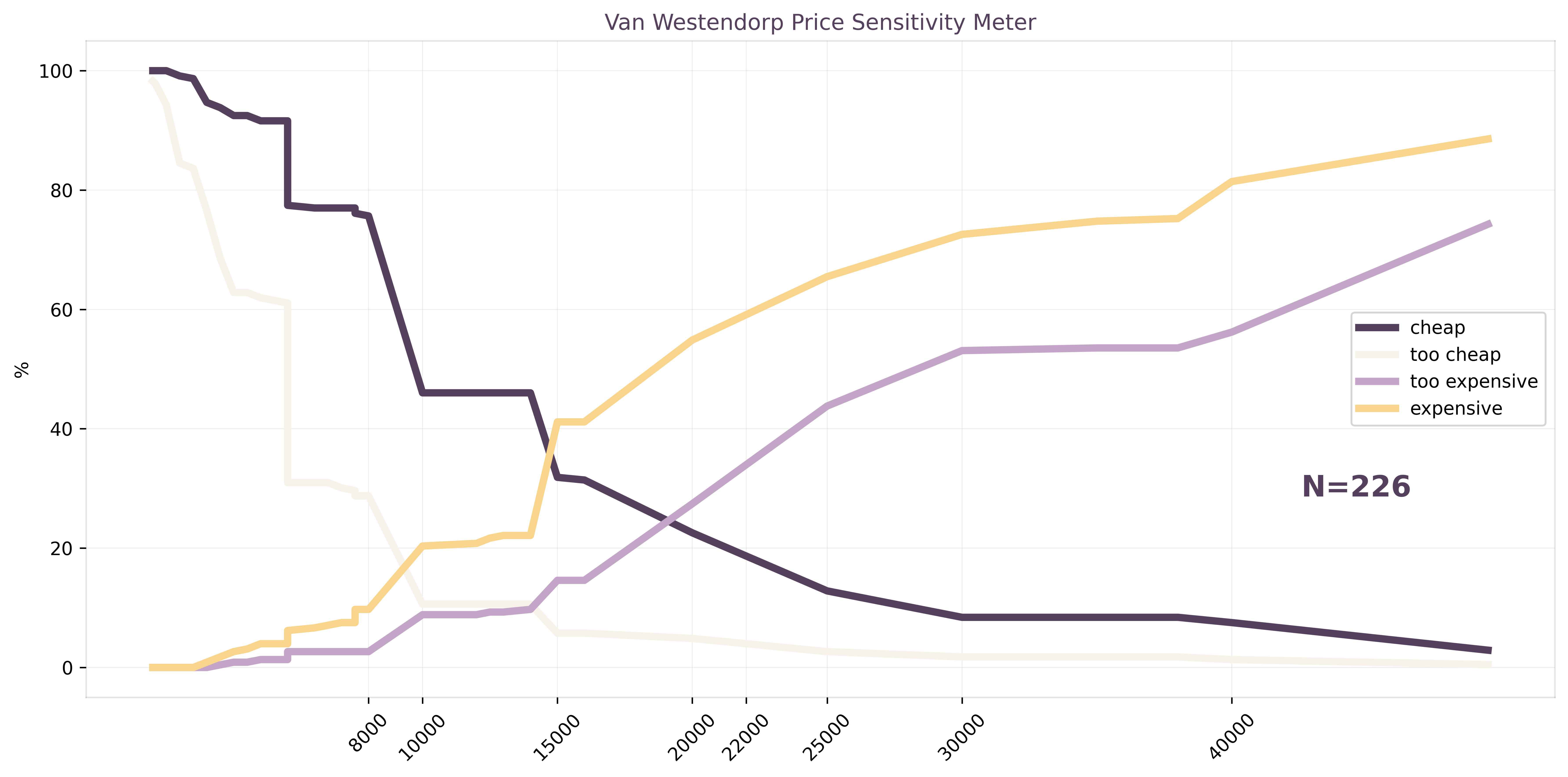 We ran a price sensitivity analysis using the van Westerndorp method. In May 2022, we conducted a similar survey when we decided to move from a closed beta to opening up access to the Kabakoo app via the Google Play Store. A comparison shows that the perceived optimal price point for a monthly payment to join Kabakoo has increased from 7500 XOF (12.59 USD) in May 2022 to 14,500 XOF (24.34 USD) in July 2024. While the interval for acceptable monthly fees was [5000 XOF, 12500 XOF] in May 2022, it is now [9500 XOF, 19500 XOF]. Even though the van Westerndorp price sensitivity meter is widely used in market research and pricing studies (let us know if you want our reference list), we acknowledge that filling out a survey and actually spending money are not the same thing.