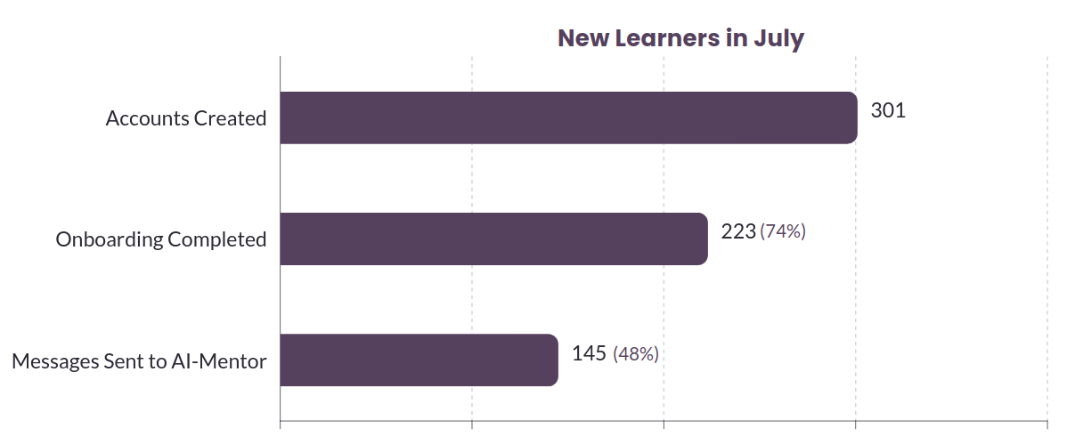 As you might recall from our last newsletter, we introduced a new version of the Kabakoo app last June, featuring an improved onboarding process, a unified interface, and enhanced personalization. Consistent with the results presented last month, the chart below shows that the update is still related to a strong onboarding efficiency and an improved learner engagement. As per our last newsletter, before the update, we had about 15% of new learners interacting with the AI mentor upon account creation. We can’t wait to see how this will unfold when we launch our next cohorts.