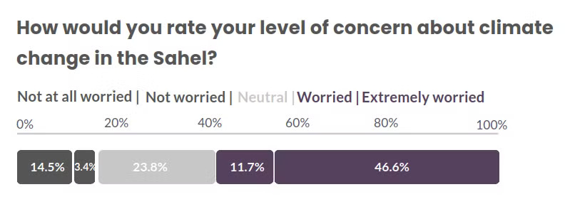 Furthermore, on a scale of 1 to 5 assessing the level of concern about climate change in the Sahel, 58.3% of young Malians express worry. Of these, 46.6% indicate the highest level of concern, placing themselves at the maximum of the scale. These figures reveal that, despite various pressing issues, climate change is already a significant concern for a substantial portion of the youth.