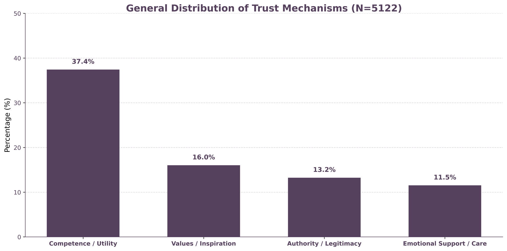 The top-line is that competence and perceived utility dominate. 37.4% of all coded responses cite the belief that the trusted entity has the skills and knowledge to actually help. Values and inspiration come second (16.0%), followed by authority and legitimacy (13.2%), then emotional support (11.5%).