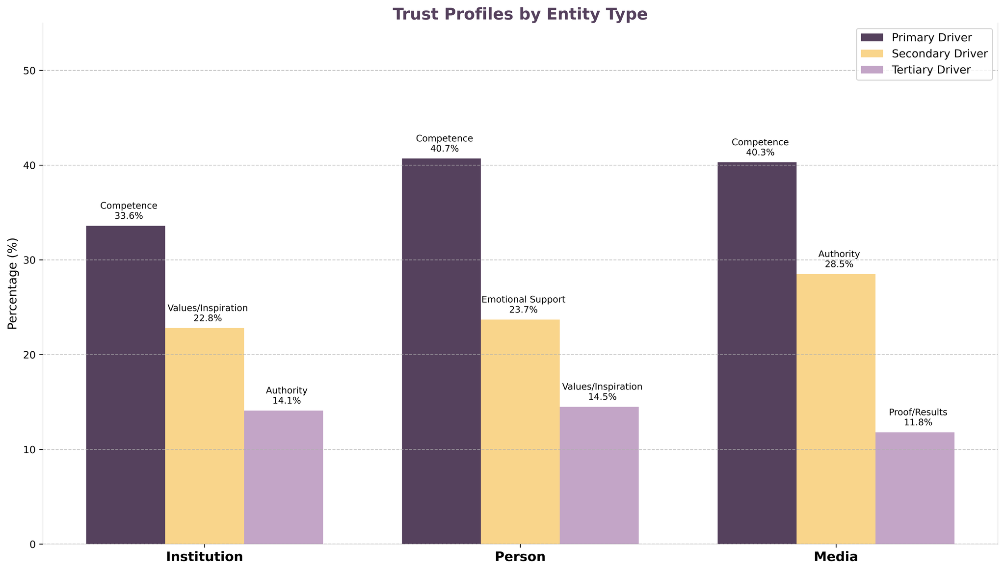 When youth explain why they trust a person (a parent, a teacher, a friend), competence still leads (40.7%), emotional support comes second at 23.7%. When the trusted entity is an institution (government, NGOs), competence drops to 33.6% and values/inspiration rises to 22.8%. And when youth explain trust in media (national TV, radio), the combination flips: competence (40.3%) plus authority (28.5%), with almost no emotional dimension.
