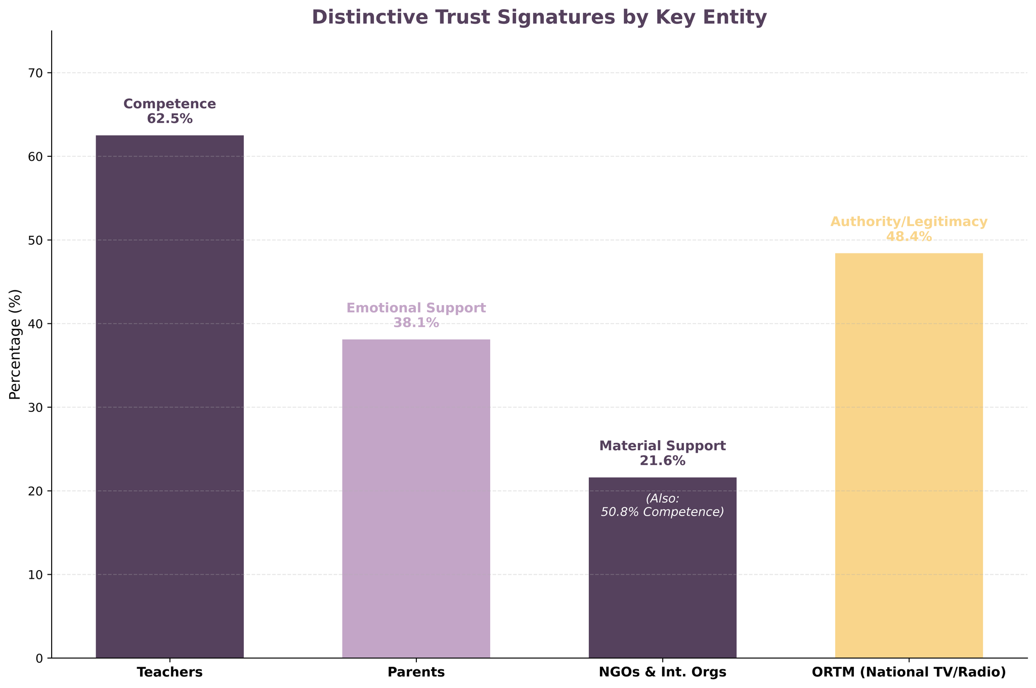 The entity-specific profiles are sharper still. Teachers score the highest competence rating of any actor with 62.5%. Parents are trusted primarily for emotional support (38.1%) and moral guidance (20.1%). ORTM, Mali’s national broadcaster, derives nearly half its trust (48.4%) from authority and legitimacy alone. And NGOs stand out for the highest material/financial support attribution (21.6%) alongside their competence score (50.8%).