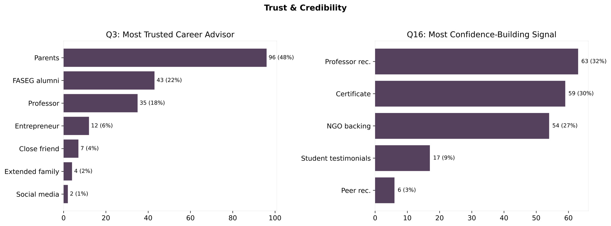 Asked who they’d trust most for career advice, 49.5% said their parents and 18.1% said a professor. Close friends land at only 5.7% and social media at 1.0%!