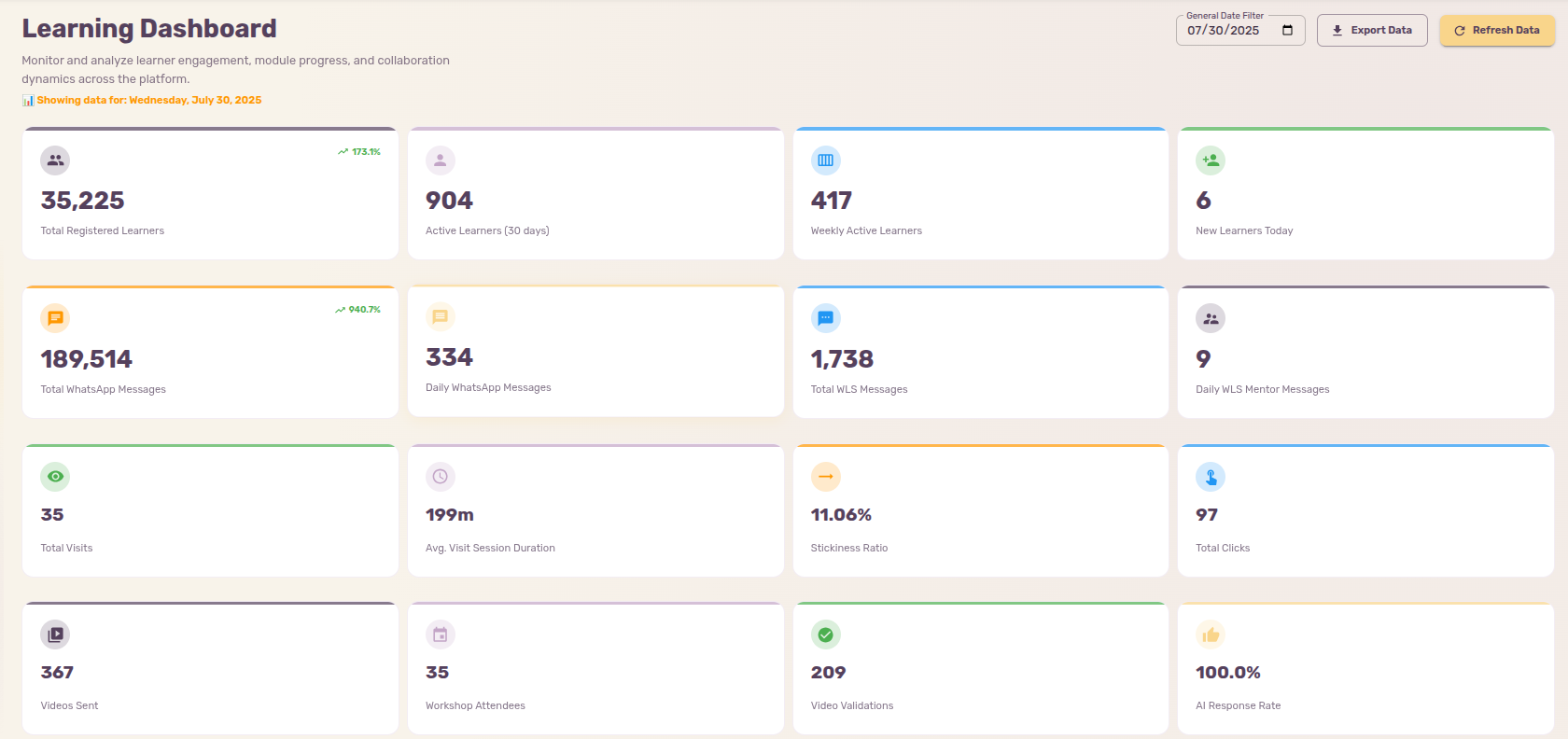 From a single screen, the dashboard brings together key engagement and short-term outcome metrics: total and active enrollments, WhatsApp message volume, AI Mentor responses, in-person workshop attendance, the flow of module videos sent and validated, etc.