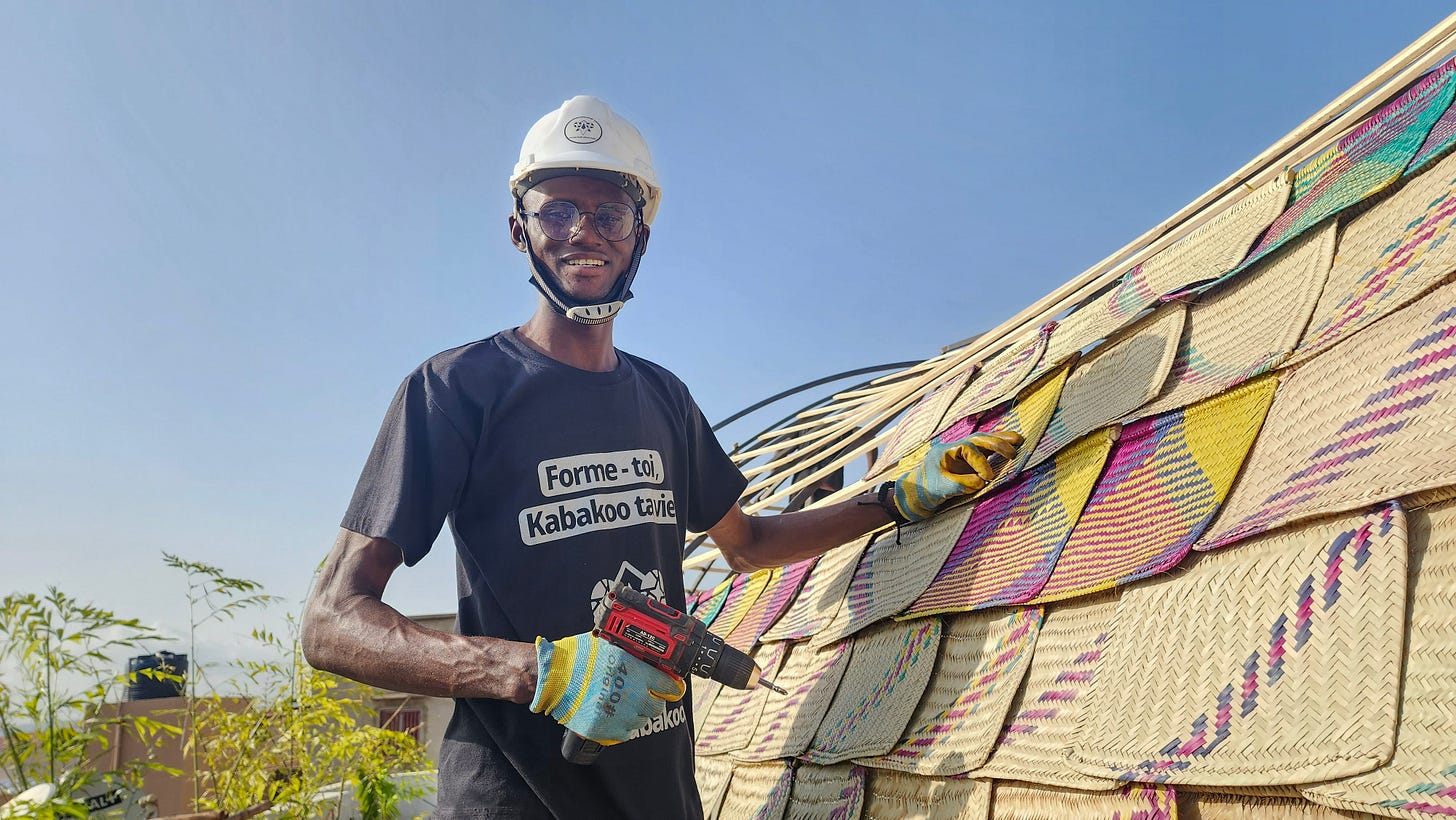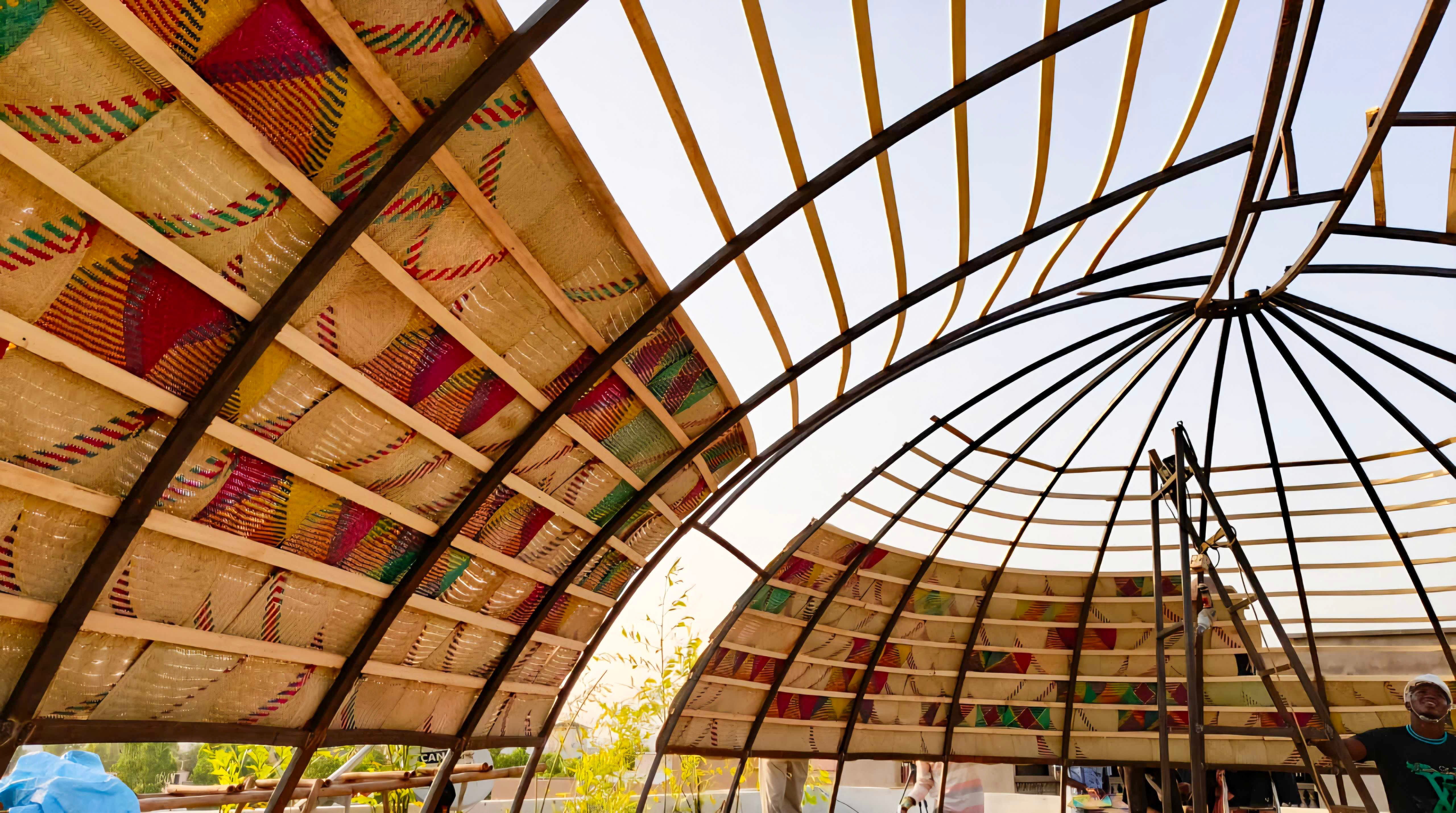 With the concept solidified, the project crashed into the beautiful, messy reality of construction. Mamadou Koné, back on site, translated the organic vision into structural logic. He and the learners took measurements on the rooftop, translating them into CAD drawings, and determining the specifications for the load-bearing steel frame—a metallic skeleton supporting a double‑curved skin of wickerwork modules. The modules would not be woven in situ but built from everyday Sahelian fans (called “fifalan” in Bambara language), iconic, affordable, and replaceable, mounted like scaled shingles.