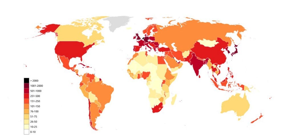 Die ökologische Schuld der Nationen: Extrahierte natürliche Rohstoffe zwischen 1950 und 2010 in Tonnen pro Hektar (Aus: A. Mayer & W. Haas, Cumulative material flows provide indicators to quantify the ecological debt, Journal of Political Ecology, Volume 23, 2016, pp. 350–363).